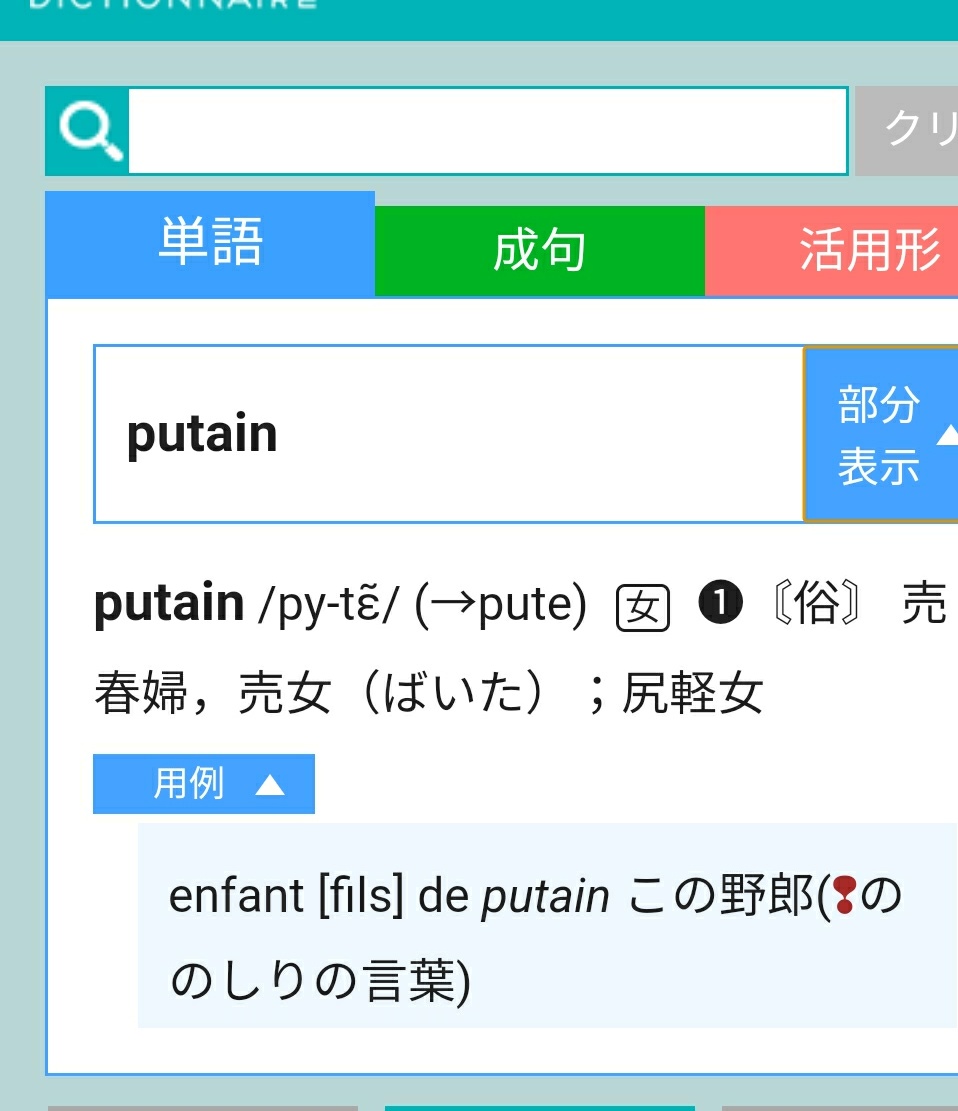 (八代《タカ》隆司)お返事、嬉しいわ。 あたしの如き小物にも律儀に。 光栄の限り。 >「『putain』は強度の侮蔑語・罵倒用語・悪罵用語であり…というデマは気になりませんか? その点はあたしもちっとも納得してないの。あたしも(同じsocio-culturelレベルであろう)同僚らも無意識に使ってる単語だしね。 (続く)