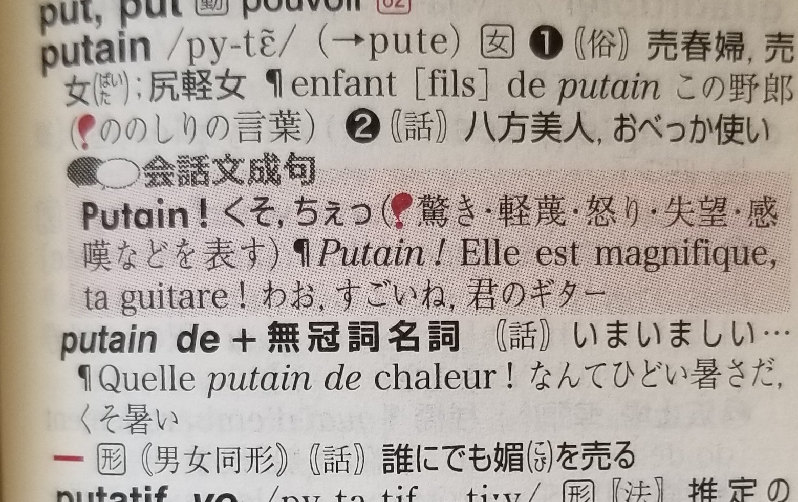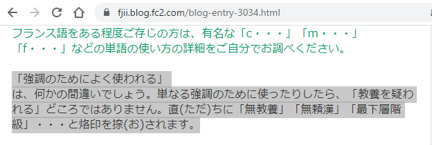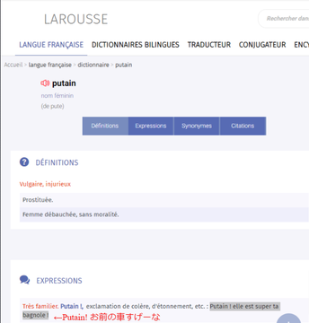 >「putain」に関する発言は完全に間違っています。強度の侮蔑語・罵倒用語・悪罵用語であり、こんな単語を普通に強調の意味で使う人がいたとしたら、たちまち「無教養」とか「無頼漢」と烙印を押されます。