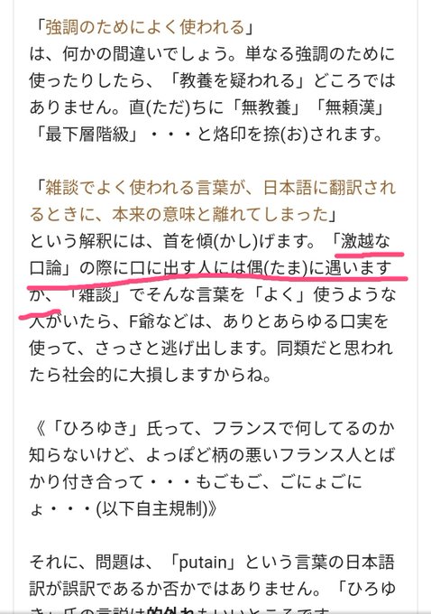 (ひろゆき)ポット出は気になっても、 「『putain』は強度の侮蔑語・罵倒用語・悪罵用語であり、たちまち「無教養」とか「無頼漢」と烙印を押されます。」というデマは気になりませんか? それとも、タカさんは、putainを使う人が一人も居ないハイソな職場にお勤めなんでしょうか。
