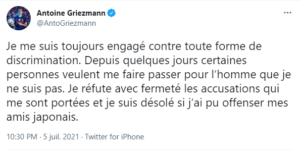 (ラテン語さん)「本人は差別を否定しています。」とは、このツイートですか?あの動画で言葉を発していたのはDembeleで、Griezmannではないです。